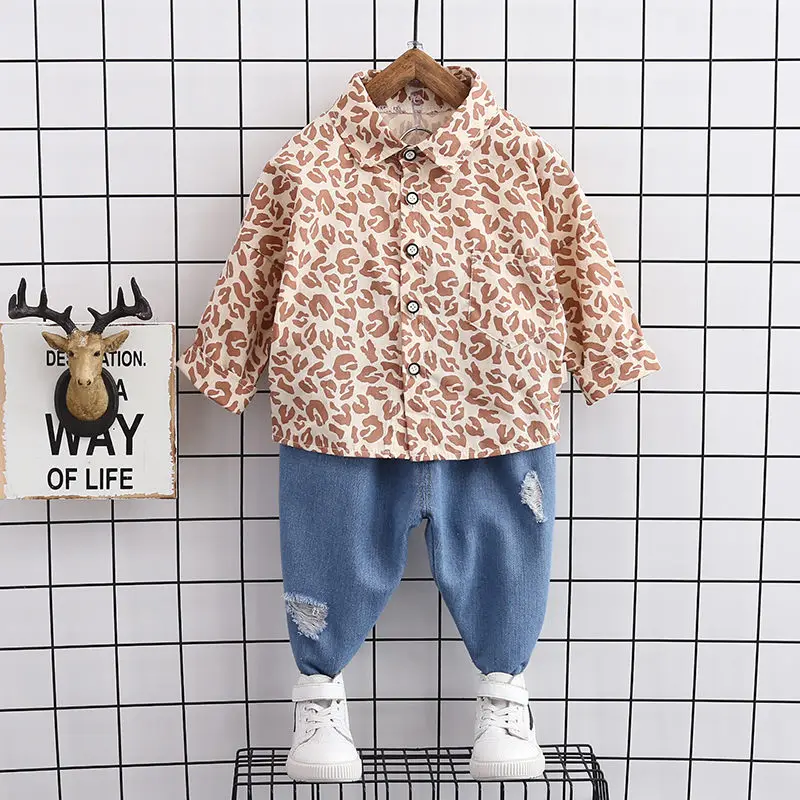 Новая весенняя детская модная одежда рубашка с принтом для мальчиков и девочек, джинсовые штаны осенний Детский костюм с длинными рукавами из 2 предметов детская повседневная спортивная одежда для От 0 до 5 лет