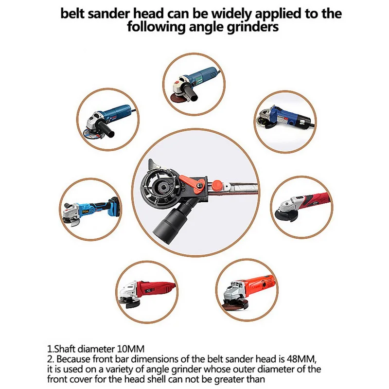 < Простота установки:Быстрая и простая установка, другие Запасные инструменты не требуются, быстро преобразует угловую шлифовальную машину в ленточный шлифовальный станок