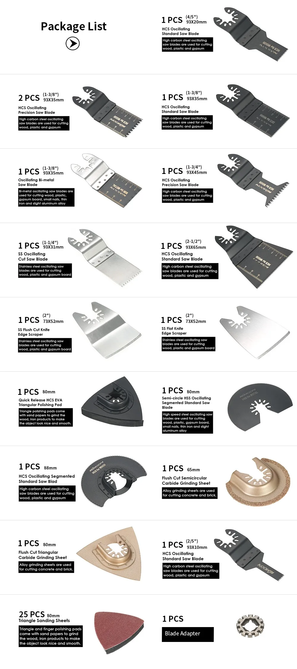 Этот профессиональный и совместимый набор режущего лезвия предназначен для многофункциональных электроинструментов с 42 шт смешанными осциллирующими пилами. Высокоуглеродистая сталь и материал нержавеющей стали Осциллирующие пильные диски используются для резки дерева, пластика и гипсокартона. Двойная металлическая и Высокоскоростная стальная колеблющаяся пила используется для резки дерева, пластика, гипсокартона, небольших гвоздей, тонкого железа и легкого алюминиевого сплава. Шлифовальные листы из сплава используются для резки бетона. Эмери шлифовальный лист используется для резки твердых предметов, таких как цемент, керамическая плитка, камень и так далее. Особенности: Высокое качество и абсолютно новый многофункциональный инструмент лезвие с новейшей пилой внутреннее отверстие (универсальное цветочное отверстие). Отлично подходит для резки ковров, кожи, линолеума, картона, дерева, ламинатов, пластмасс, мягкого металла и гипсокартона. Прецизионные лезвия обрезаются через ламинированный материал без сколов и конструкция большого зуба сопротивляется загрузке и улучшает скорость резки с помощью острых зубов. Подробные маркеры глубины по бокам позволяют делать точные порезы быстро и легко каждый раз. Обеспечивают большую долговечность, длительный срок службы и быструю скорость резки для промывки и вырезов твердых материалов и цветных металлов. Отличный аксессуар для строительной промышленности, горнодобывающей промышленности, строительства шоссе и строительных мостов, подходит для большинства универсальных машин. Высокая твердость, высокая износостойкость и отличная ударопрочность для сноса, сантехники, переделки и общей резки древесины и мягкого металла. Технические характеристики: Цвет: мульти Цвет Материал: Высокоуглеродистая сталь + биметалл + нержавеющая сталь + сплав + Высокоскоростная сталь Подходит для резки: ковров, кожи, линолеума, картона, дерева, ламинатов, железных гвоздей, тонкого железа, пластмасс и т. Д. Совместимость с брендами осциллирующих мульти-инструментов: для Fein Multimaster, Porter Rockwell Cable, Black & Decker, Bosch Craftsman, Ridgid Ryobi, Makita Milwaukee, Dewalt, Chicago и многое другое Тип: комбинированный Осциллирующий пильный диск Количество: 42 шт Размер посылка: прибл. 16*12*6 см/6,30*4,72 * 2.36in Вес посылка: прибл. 445 г/15,68 унций Примечание: Наши пильные диски не подходят для следующей модели машины. Не совместим с Bosch PMF350/MX30/MX30E. Не подходит для Dremel MM40/MM45. Не совместим с инструментами быстрого крепления Dremel или Bosch Не совместим с использованием Fein Starlock. Посылка список: 1*93*10 мм (2/5 ") HCS Стандартный Осциллирующий пильный диск для дерева/пластика/мягкого металла 1*93*20 мм (4/5 ") HCS Стандартный Осциллирующий пильный диск для дерева/пластика/мягкого металла 2*93x35 мм (1-3/8 ") HCS Стандартный Осциллирующий пильный диск для дерева/пластика 1*93x35 мм (1-3/8 ") HCS точный японский зуб Осциллирующий пильный диск 1*93x35 мм (1-3/8 ") Биметаллический" Пожиратель ногтей "Осциллирующий пильный диск 1*93x45 мм (1-3/4 ") HCS прецизионный Осциллирующий пильный диск для дерева/пластика 1*93*31 мм (1-1/4 ") SS Стандартный Осциллирующий пильный диск 1*93x65 мм (2-1/2 ") HCS Стандартный Осциллирующий пильный диск для дерева/пластика/мягкого металла 1*73x52 мм (2 ") SS скребок для кромок ножа 1*73x52 мм (2 ") SS плоский скребок для ножей 1 * БЫСТРОРАЗЪЕМНАЯ 80 мм HCS EVA треугольная полировальная прокладка 1*80 мм полукруглый 