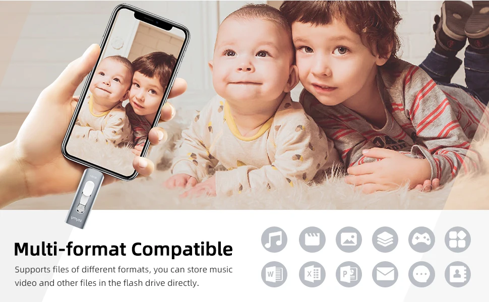 Запасной диск флэш-диска iPhone имеет Высококачественный чип и реальную полную емкость памяти драйвера iPhone. Все файлы переносятся на внешнюю память USB 3,0 флэш-память драйвера iPhone для стабильной передачи и просмотра, и их можно просматривать в любое время. Флэш-накопитель iPhone Подходит для флэш-накопителя 256 ГБ IOS, запасного накопителя для смартфонов iPhone OTG.