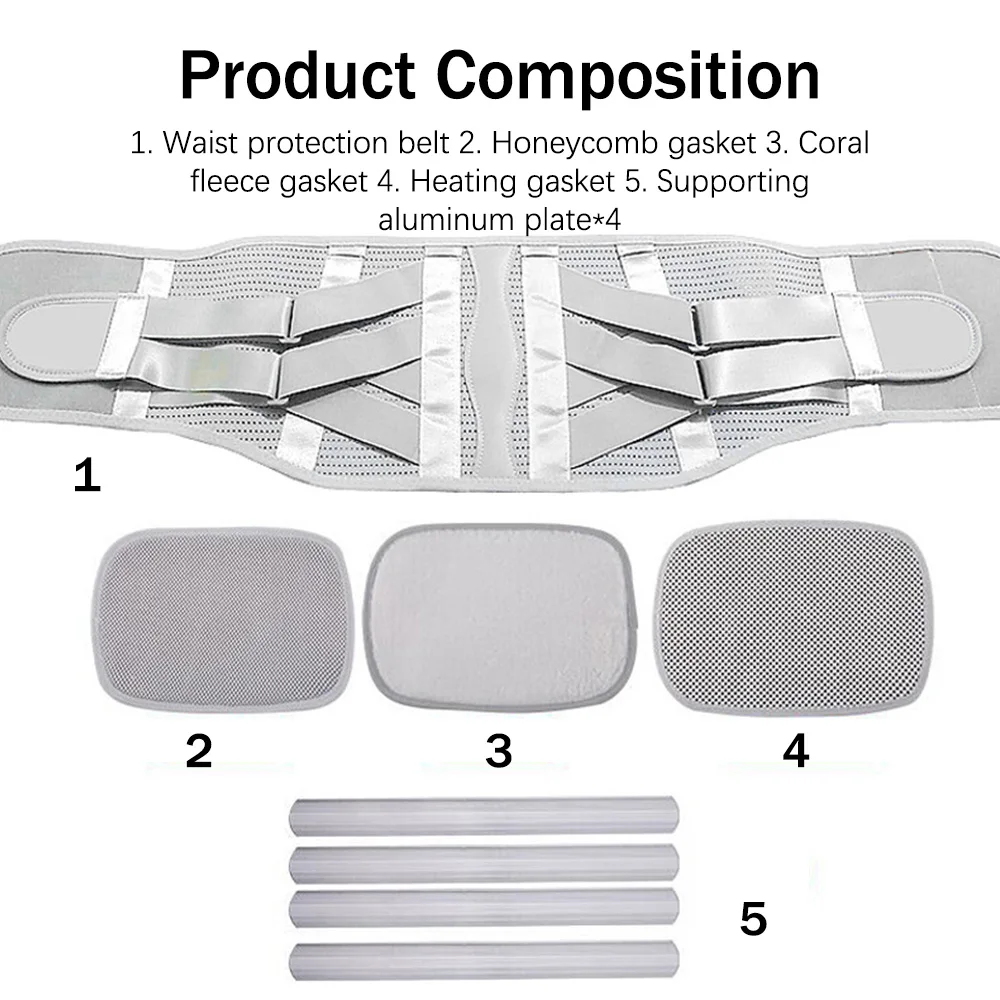 1. Ремень для защиты талии 2. Сотовая прокладка 3. Коралловая флисовая прокладка 4. Нагревательная Прокладка 5. Поддерживающая алюминиевая пластина * 4