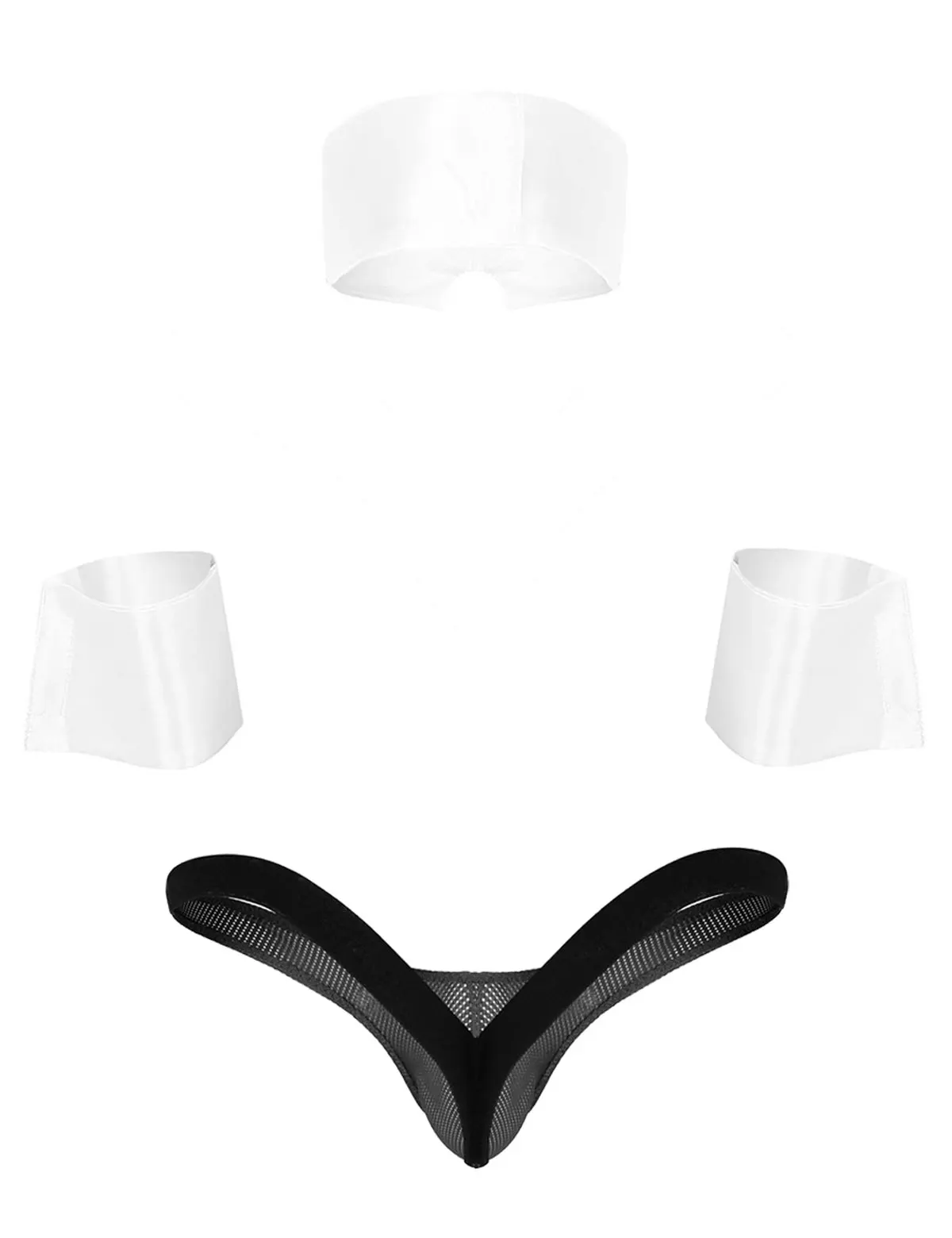 Комплект включает в себя: 1 воротник, 2 манжеты, 1 мужская стринги