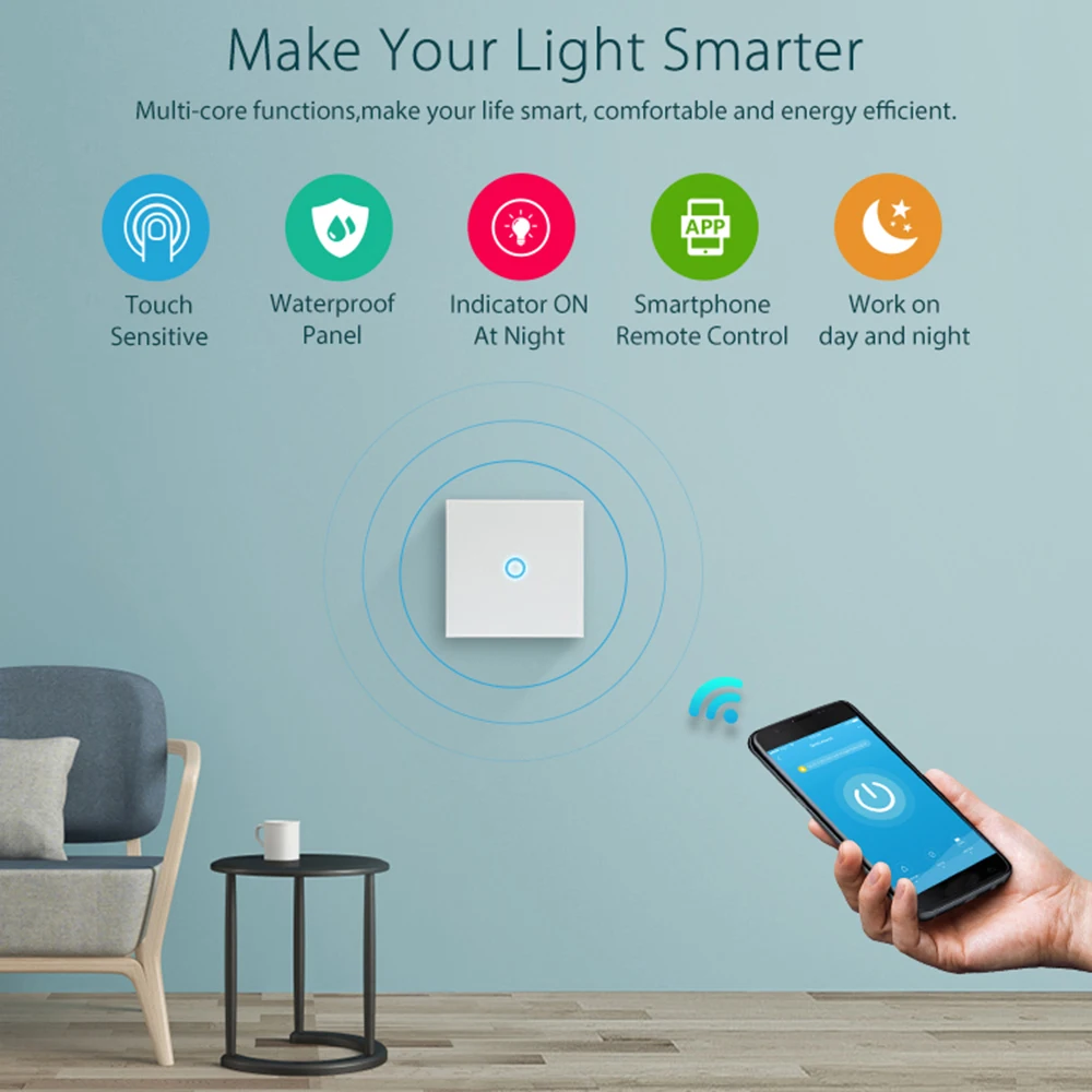 Простота установки: smart wifi светильник переключатель, с помощью одной кнопки, не нужно поработать с бытовыми стерео-и шлюз, 2,4 ГГц протокол более стабильна, быстрее и удобно.