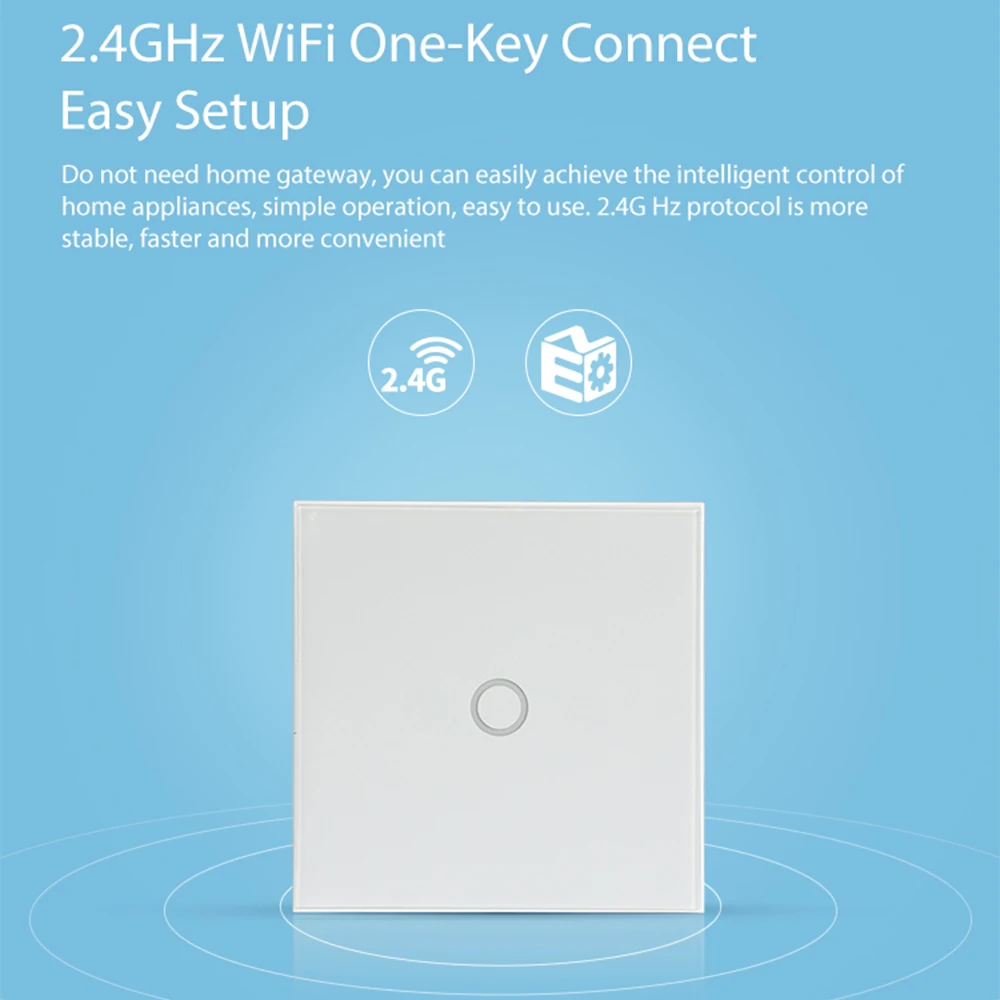 Интеллектуальная беспроводная (Wi-Fi) 1 Gang светильник переключатель, характеристики 2,4 ГГц Wi-Fi с помощью одной кнопки подключения, прост в установке, не нужен домашний шлюз, вы можете легко достичь интеллигентая (ый) управления бытовой техникой.