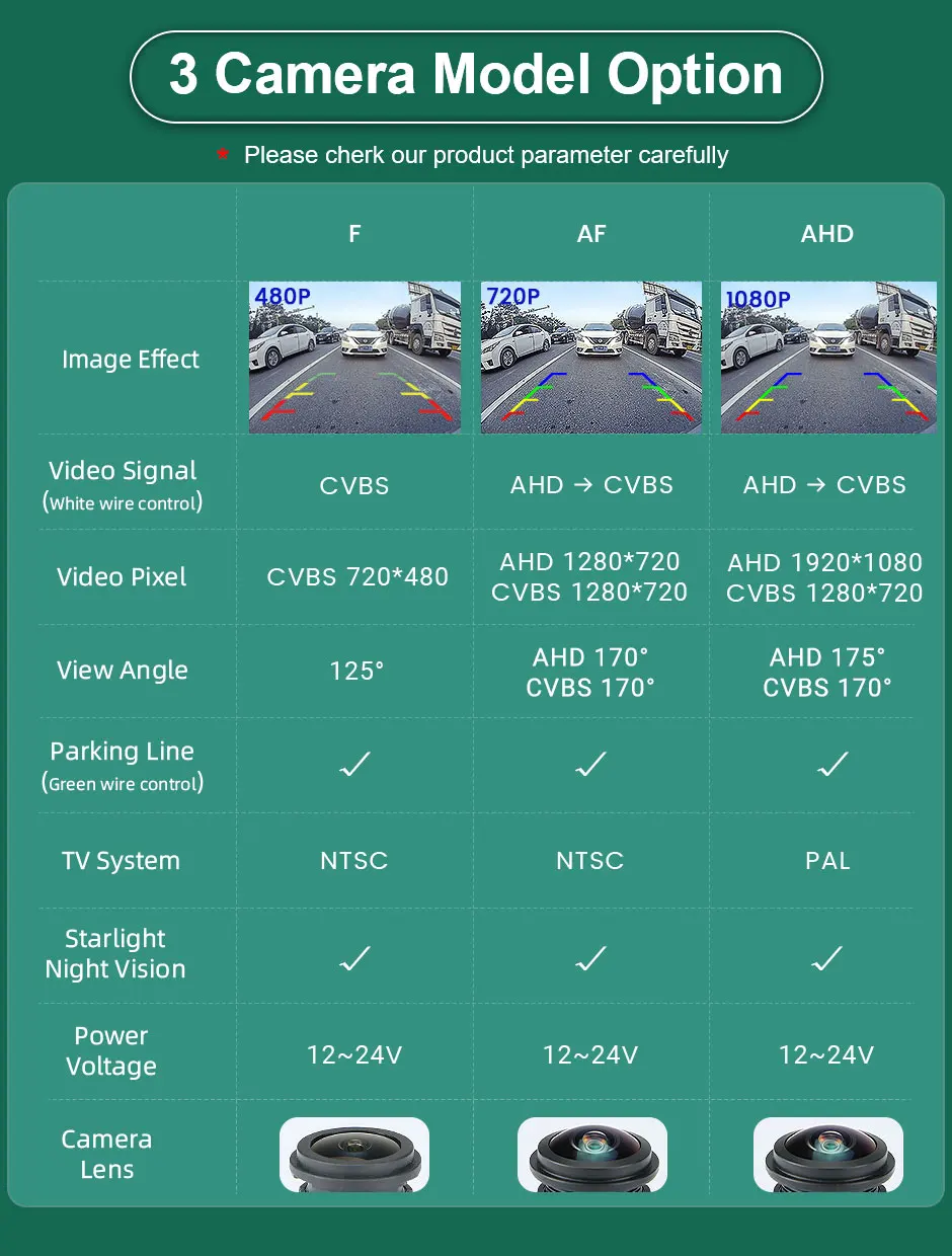 * The Camera support both AHD and CVBS video signal, it can work with both AHD Android monitors and all CVBS TFT monitors.