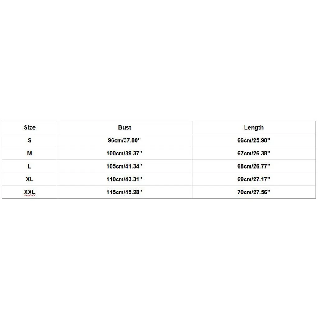 Размер Бюст Длина S 96 см/37,80'' 66 см/25,98'' М 100 см/39,37'' 67 см/26,38'' L 105 см/41,34'' 68 см/26,77'' XL 110 см/43,31'' 69 см/27,17'' XXL 115 см/45,28'' 70 см/27,56''Размер: S Обхват груди: 96 см/37,80 дюйма Длина: 66 см/25,98'' Размер: M Обхват груди: 100 см/39,37 дюйма Длина: 67 см/26,38'' Размер: L Обхват груди: 105 см/41,34 дюйма Длина: 68 см/26,77 дюйма Размер: XL Обхват груди: 110 см/43,31 дюйма Длина: 69 см/27,17'' Размер: XXL Обхват груди: 115 см/45,28 дюйма Длина: 70 см/27,56''