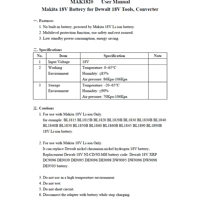1. Этот адаптер MAK1820 предназначен для использования литиевых батарей makita, которые работают с dewalt Old 18В ni-cd ni-MH. Замена старых аккумуляторов Dewalt 18В Ni-Cad DC9096 DC9098 DE9039 DE9095 DE9096 DE9098 DW9095 DW9096 DW9098.