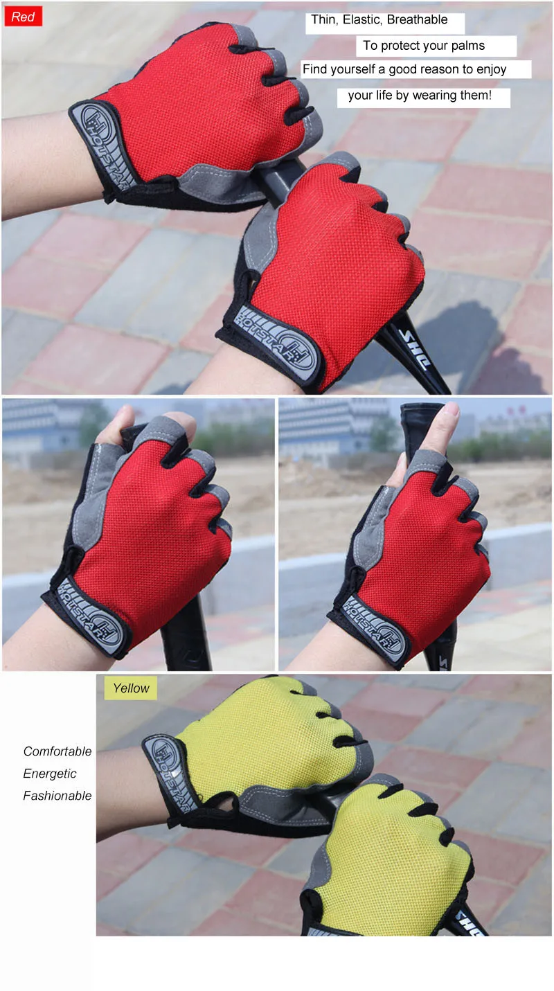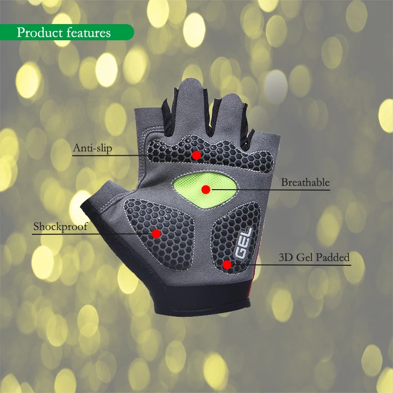 Гелевая силиконовая подкладка, 3d резка, обтекаемый дизайн. Сетчатый материал с защитой от ударов. Высококачественная лайкра, дышащая, ультратонкие впитывающие полотенца для пота, высокая эластичность. Легкая конструкция, двойной процесс шитья, увеличение интенсивности. Удобный, дышащий, привлекательный внешний вид. Быстро и легко снимается пальцы. Быстрая застежка-липучка на запястье.