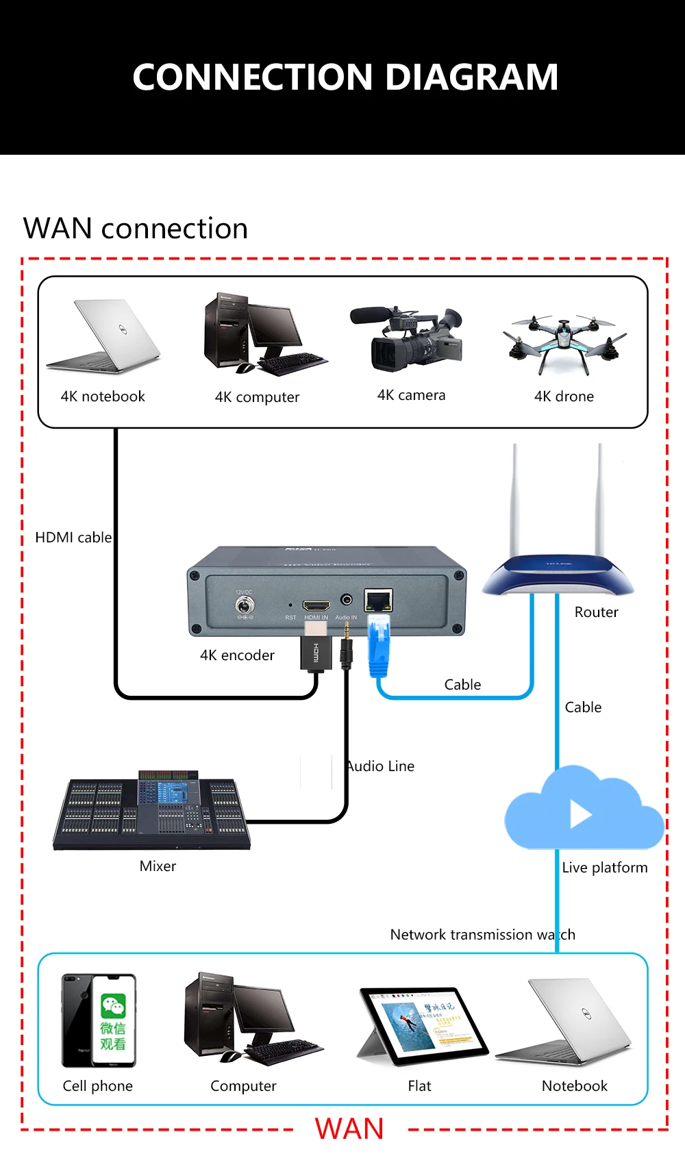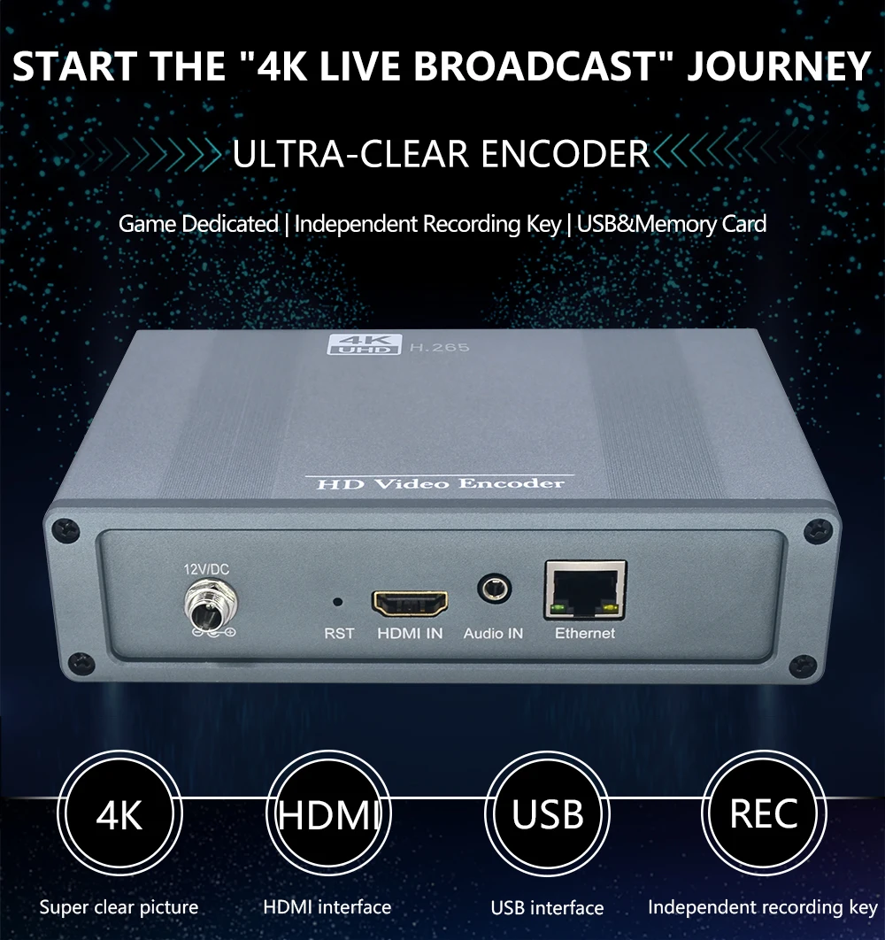 Высокоэффективное кодирование видео с поддержкой H.265Интегрированный LINUXПоддержка H.264 BP/MP/HPПоддержка ACC / MP2 /MP3 /AC3 /G711 Расширенный формат кодирования качества звукаQr-код CBR/VBR контроль скорости, 16 Кбит/с ~ 12 Мбит/сСетевой интерфейс использует полнодуплексный режим 1000 мОсновные и второстепенные потоки могут подтолкнуть различные сервераПоддержка видеовхода HD с разрешением 720P-4K 30 ГцПоддерживаемые настройки параметров изображенияПротокол Onvif, поддержка NVR, декодер, программное обеспечение платформы различных производителей;Несколько уровней кодирования: H.264/AVC высокий профиль (до уровня 5,1), совместим с основным профилем и базовым уровнем;Поддержка отечественных основных видео трансляционных платформ: манго ТВ, манго live, Tencent video, Xunlei Live, Youku, Huajiao Live, Witness, NetEase CC, NetEase BOBO, YiLive, Douyu, Yingke, И т. д.;Поддерживаемые международные видео-платформы: YouTube, UStream, Twitch и т. Д.Поддерживаемые внутренние и зарубежные потоковые медиа-сервисные платформы/CDN системы: Wowza, FMS, RED5, SRS, Xtream коды, медиа-сервер, Alibaba Cloud, Austrian Cloud и т. Д.;Функция суперпозиционирования персонажа/изображения, можно регулировать координаты;Поддерживает настройку изображения при отсутствии входного сигнала;Поддержка логотипа по индивидуальному заказуКодировка hdmi-сигнала поддерживает протокол HDCP и Blu-Ray HDПоддержка HTTP, UTP, RTSP, RTMP, RTP, протокол ONVIFОсновных и вторичных потоков используют различные сетевые протоколы для передачиПользовательский веб-интерфейс, китайский и английский интерфейс конфигурации опциональноУправление веб-интерфейсомПоддержка WAN удаленного управления (WEB)Поддерживает Пользовательские настройки вывода для разрешения потокаОпция поддерживает функцию вставки китайских и английских символов в поток кода, фоновый шрифт и цветПоддержка потока кода для вставки 4 прозрачных изображений функция водяного знака, ось XY может быть установленаПоддержка однокнопочного восстановления заводской конфигурации Предоставляет интерфейс конфигурации HTTP