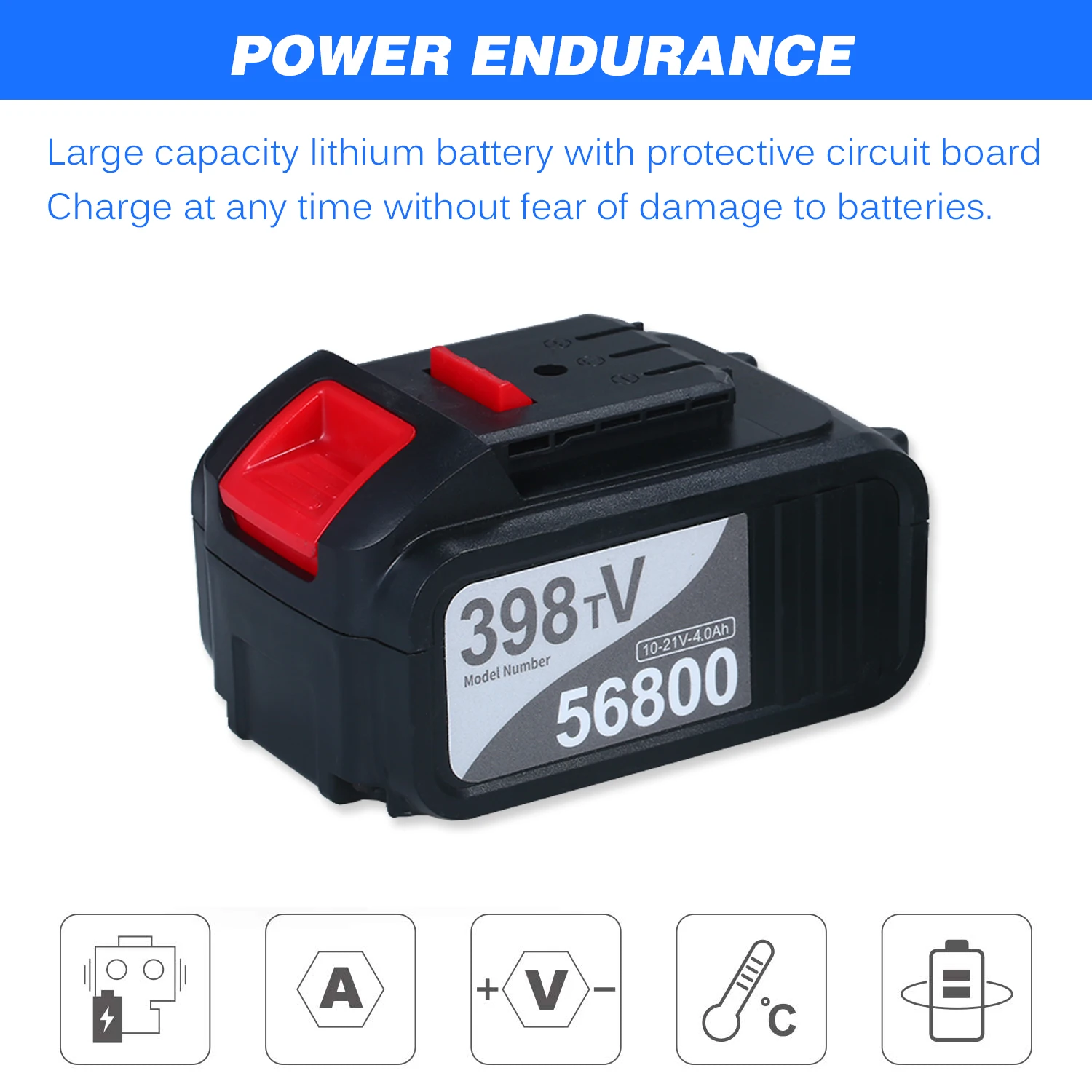 2 шт. аккумулятор 4000 мАч длительная работа --- 21 в 4000 мАч Большая емкость литий-ионный аккумулятор с индикатором мощности в реальном времени. 2а ультра быстрое зарядное устройство занимает всего 3 ч для полной зарядки, держит гаечный ключ постоянно работает. С прочной коробкой для инструментов, вы можете легко держать этот ключ в вашем автомобиле и носить его с собой в любом месте.