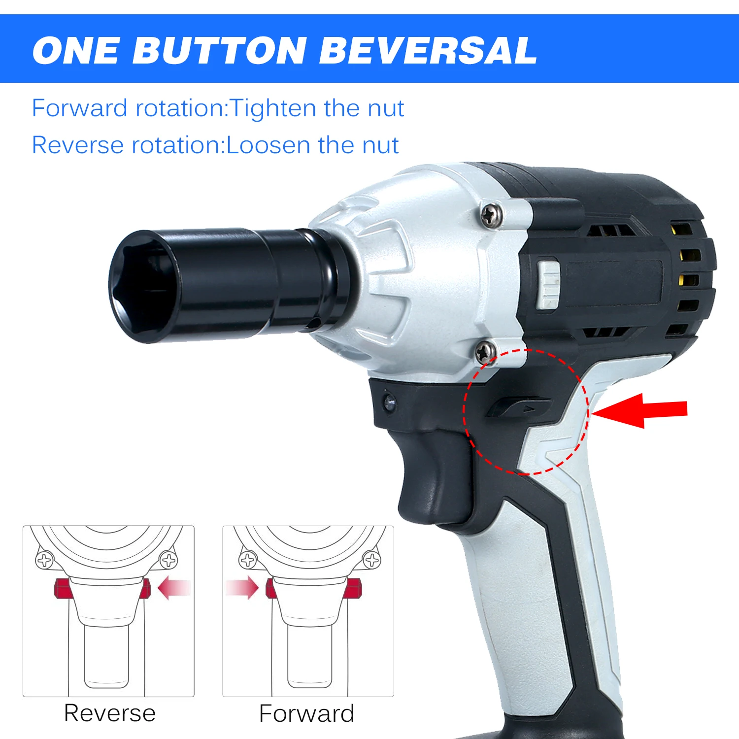 Вперед и назад Кнопка --- с вперед и назад Кнопка, которая позволяет легко изменить направление вращения, используется для затягивания или ослабления гаек и болтов. Сочетается с корпусом из алюминиевого сплава, который предотвращает повреждение инструмента в случаях грубого обращения.