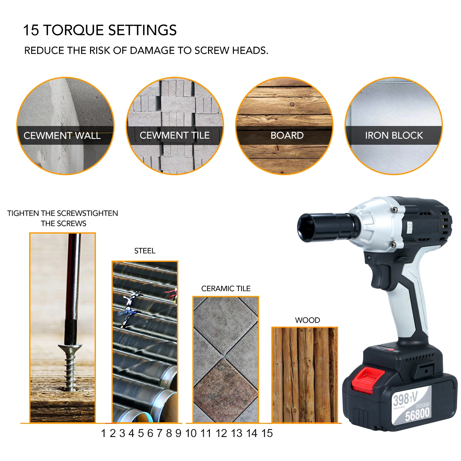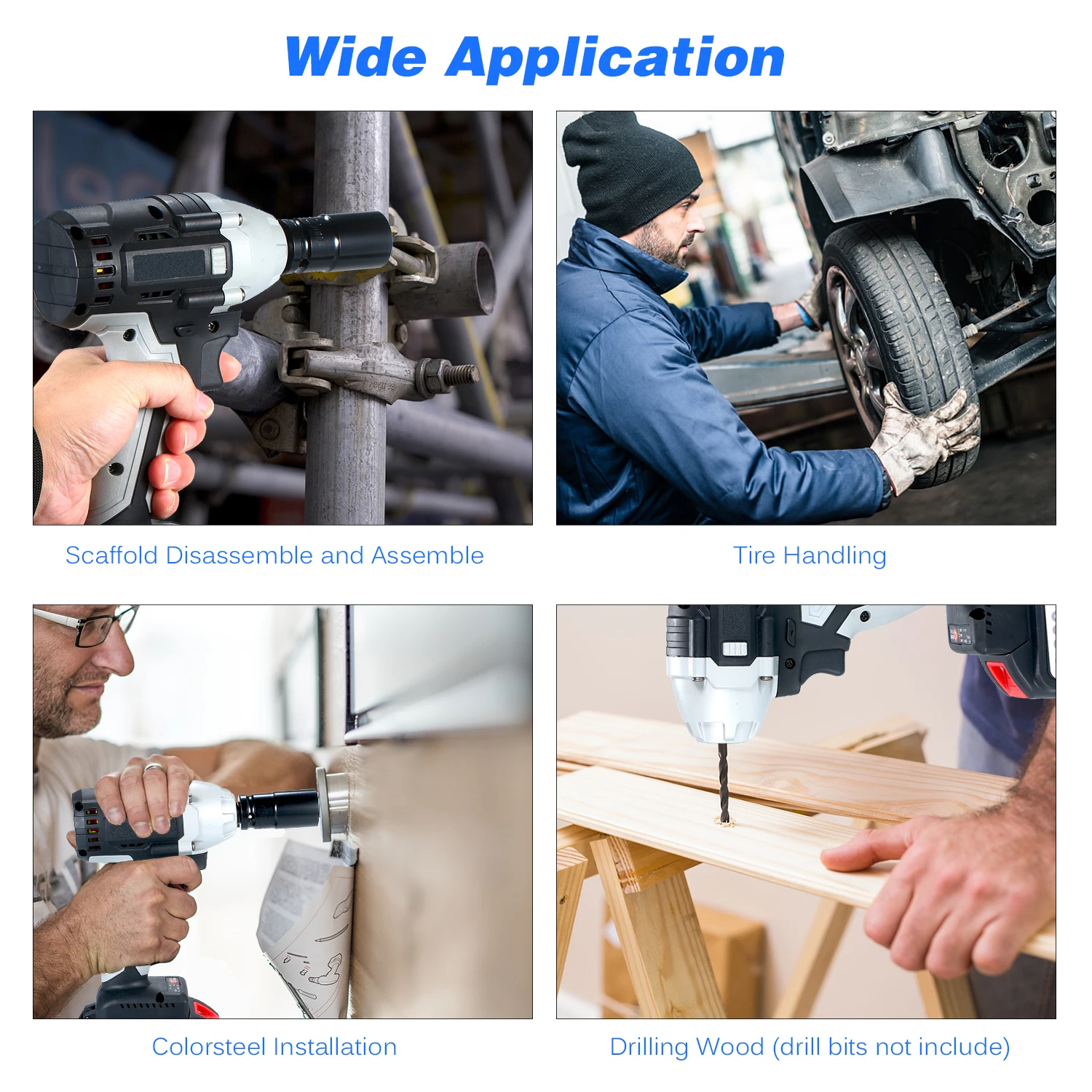Мощный бесщеточный ударный гайковерт --- мощный двигатель может доставить крутящий момент до 980нм (8673,74 lbf.in), который идеально подходит для затяжки гаек и ослабления болтов. Его высокий крутящий момент также способен заниматься ремонтом автомобилей, крупными строительными проектами, обслуживанием тяжелого оборудования или сборкой продукта.