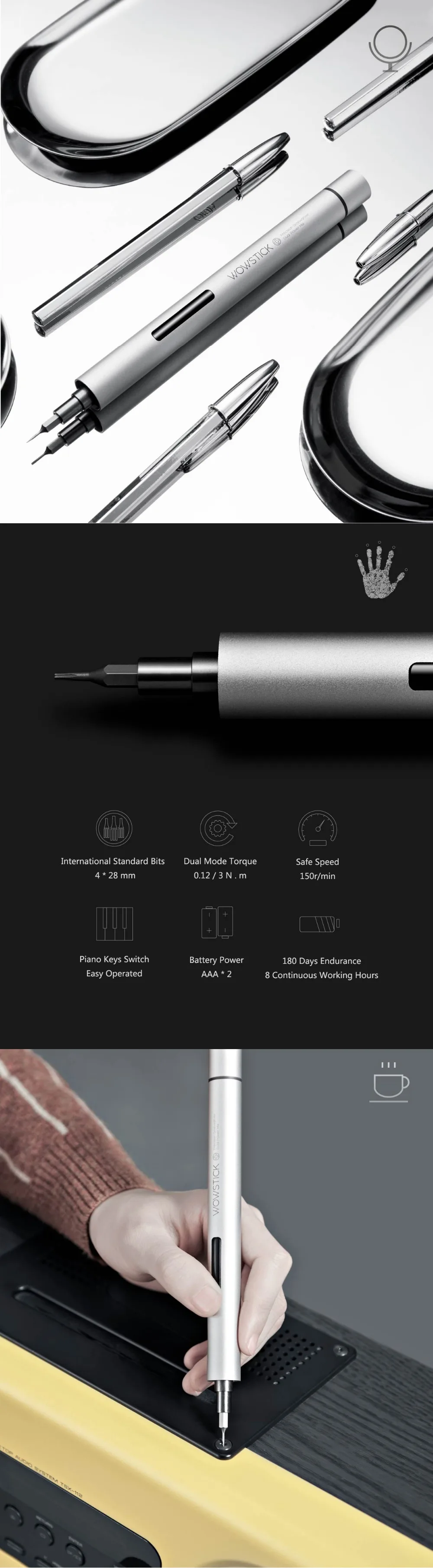 Параметры продукта Цвет изделия: серебристый Внешняя упаковка: Продвинутая белая коробка для карт Общий вес продукта: 130 г Источник питания: сменный аккумулятор AAA2 Срок службы изделия: 180 дней/8 часов непрерывной работы Режим работы: Двойной режим крутящего момента 0,12/3.00N · m Размер бит: 4 "28 мм Битовая Модель: PH000, PHO, PH2, SL1.0, SL20, SL3.0, T5, T6, T8, P2(O.8), P5 (1,2), P6 (1,5), H2.5, H3, SQ0, 3,0, Y0.6, Y2.5, U3.0, сквозная игла 0,8 Скорость продукта: 150 об/мин Функция продукта: Разборка винтов и сборка фокусируются на двухмощном гибридном однокнопочном режиме, необходимо попробовать